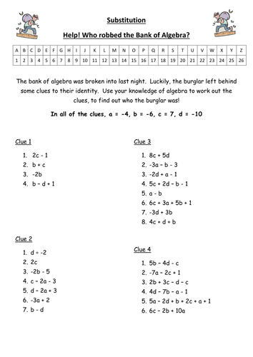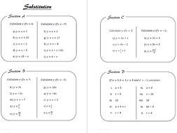 Substitution | Teaching Resources docx, 39.82 KB A lesson on substituting positive and negative integers into various algebraic expressions including those involving squares. PowerPoint with two worksheets (easier and harder) and a treasure hunt activity for kinaesthetic learners. Mini whiteboard plenary in the middle of the lesson and a Catchphrase to end the lesson.